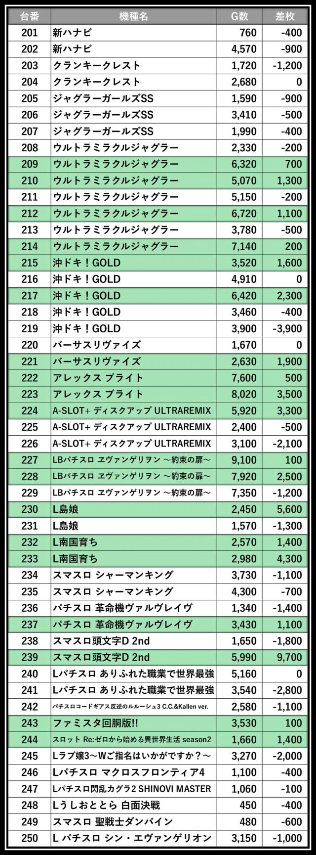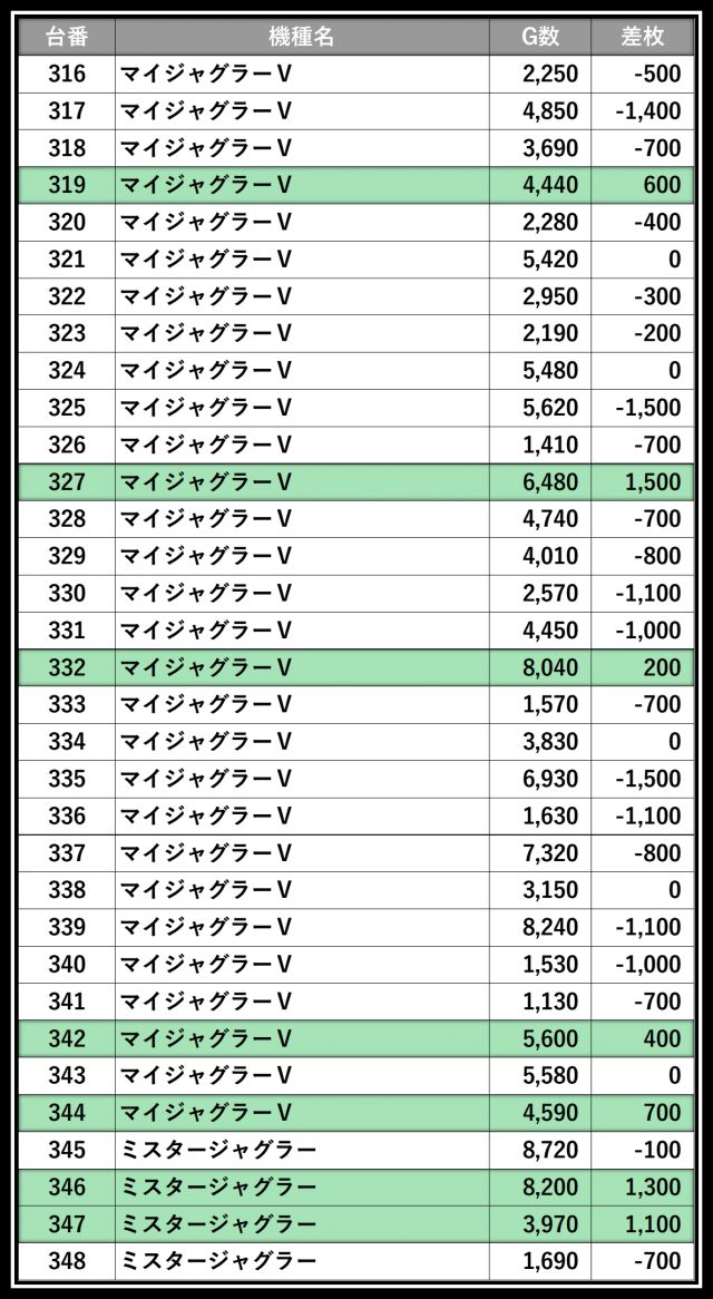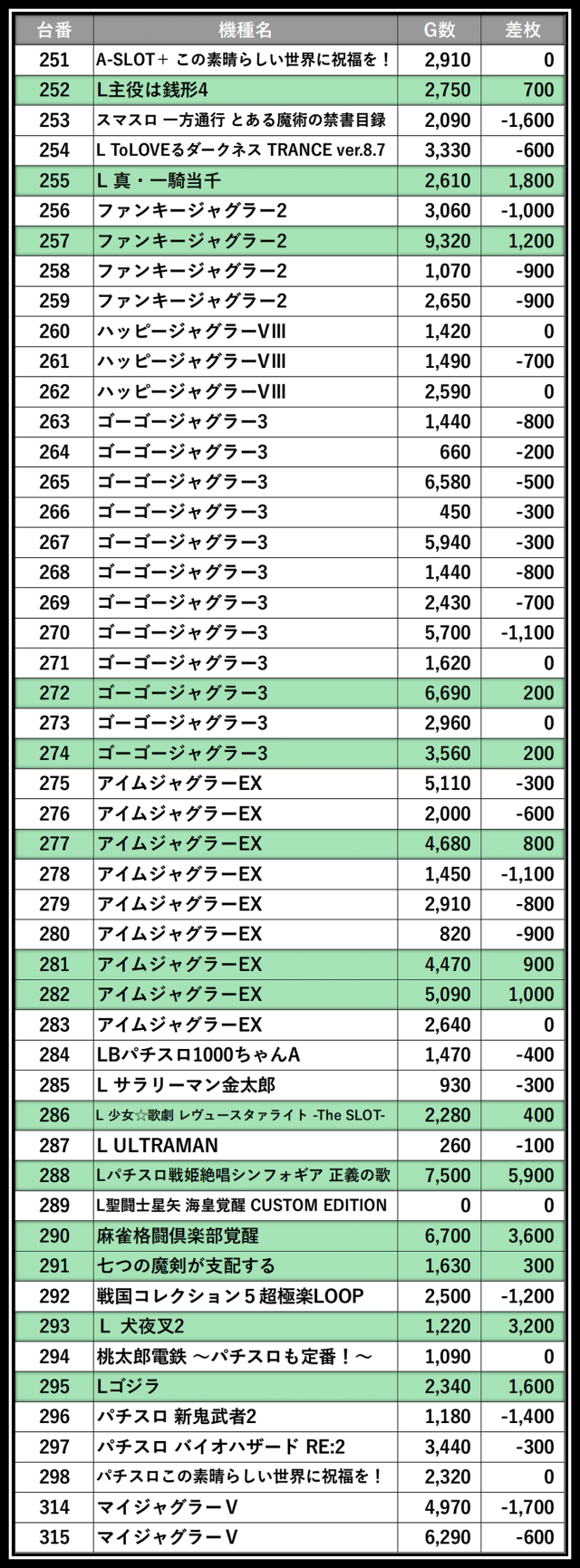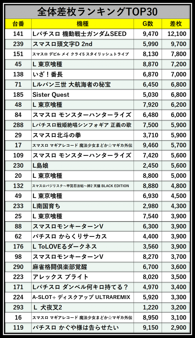 ※差枚数順に掲載しています