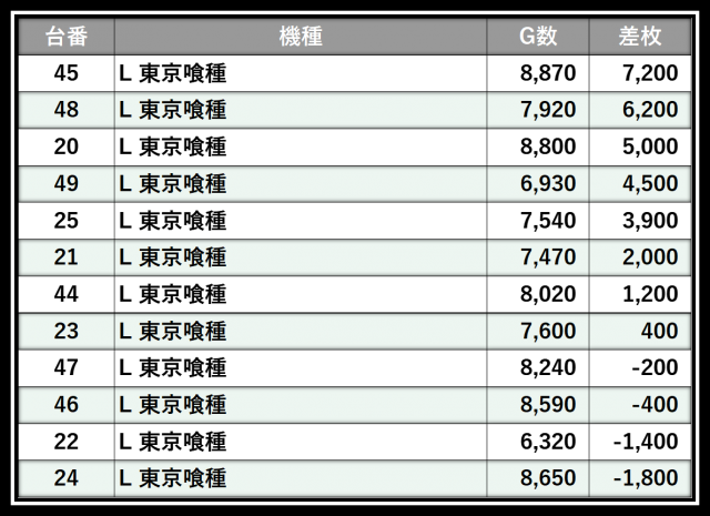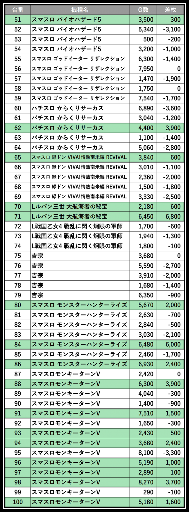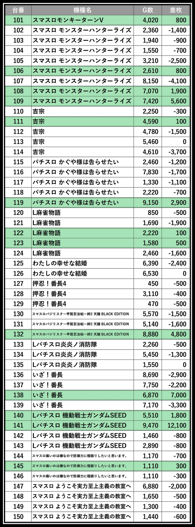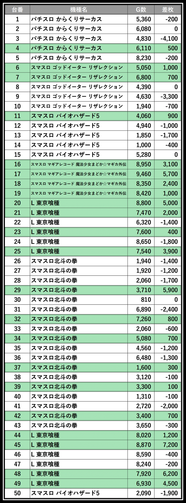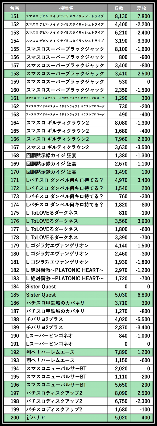 ※差枚数順に掲載しています