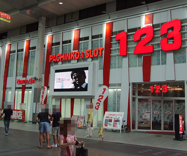 にぎやかな商店街のなかにあり、大型のモニターがついている外観も特徴的なホールだ。