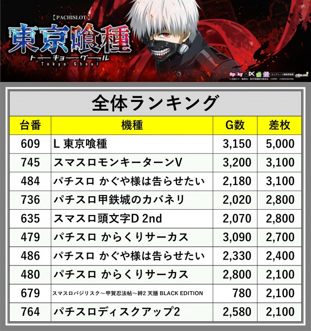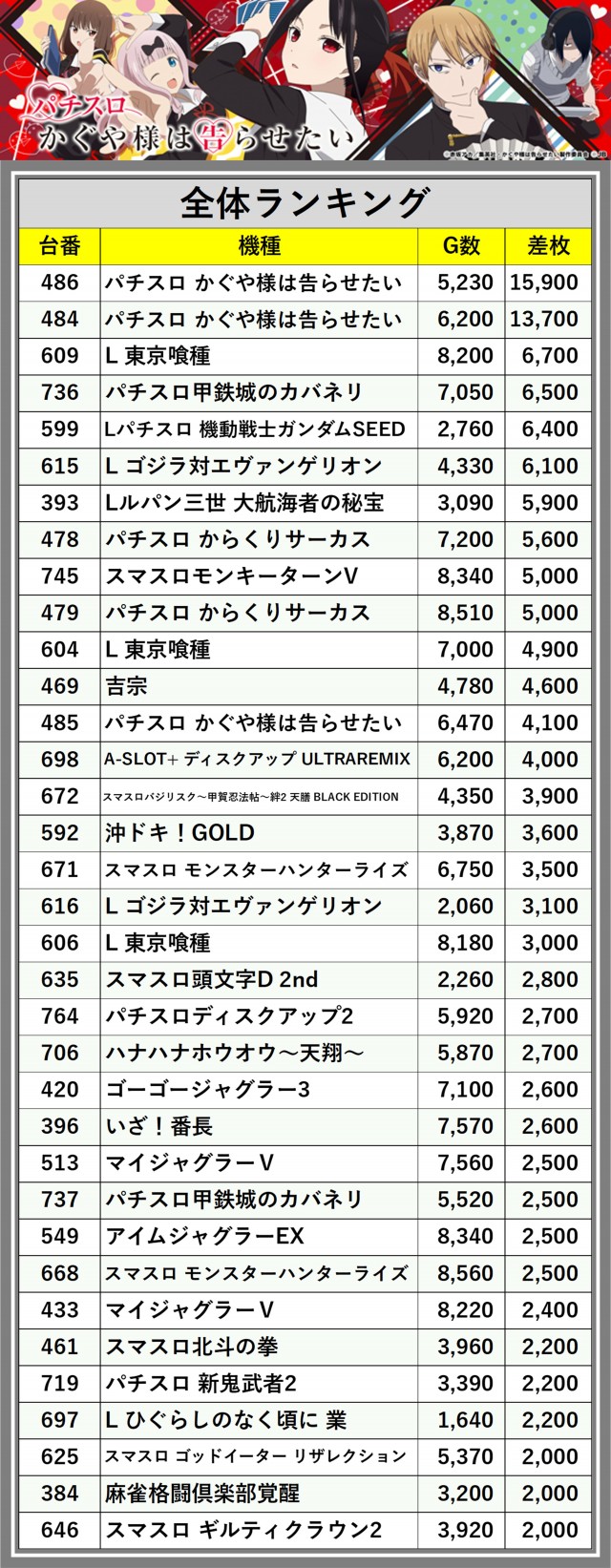 ※差枚数順に掲載しています