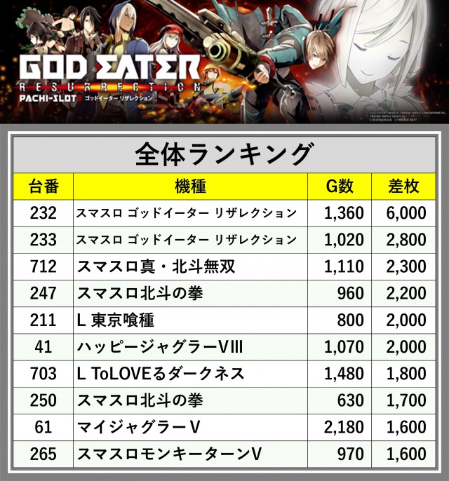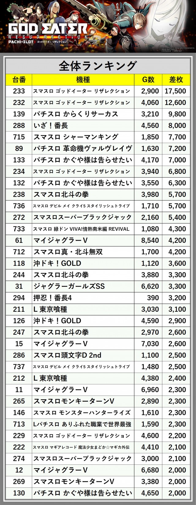 厳選された取材対象機種をはじめ、その他スロット全体から好記録が飛び出した!プレイヤーが楽しんだ1日を下記データにて振り返ってみて欲しい。