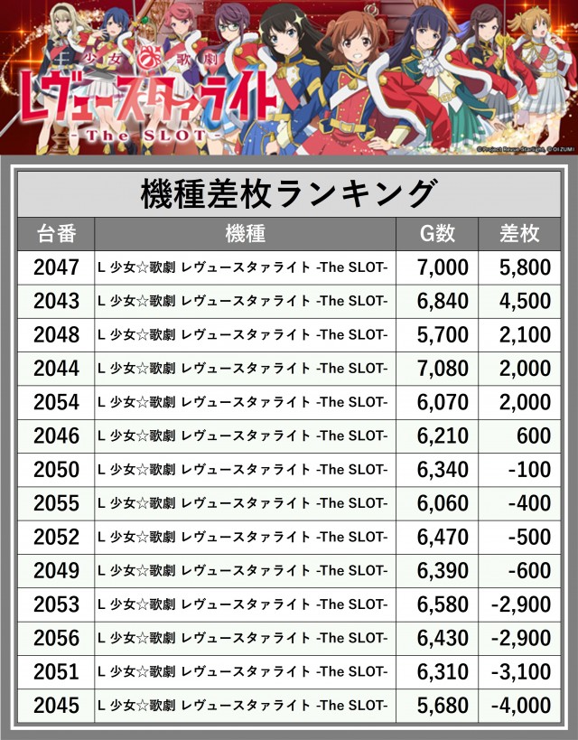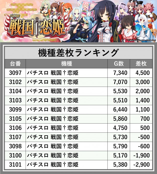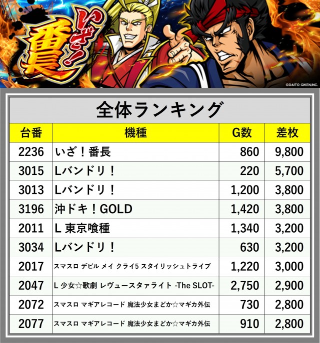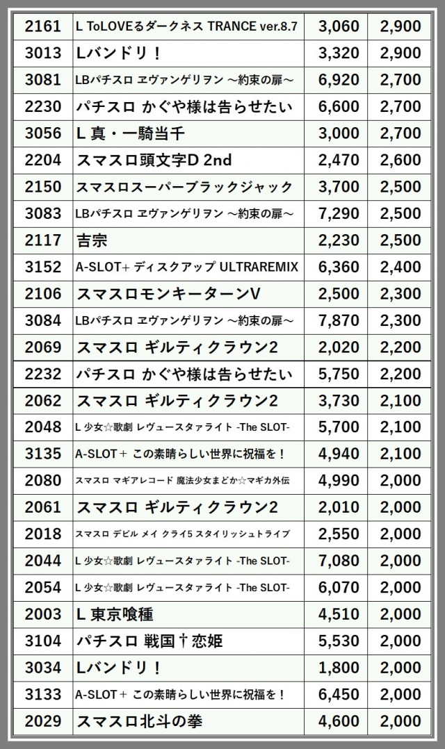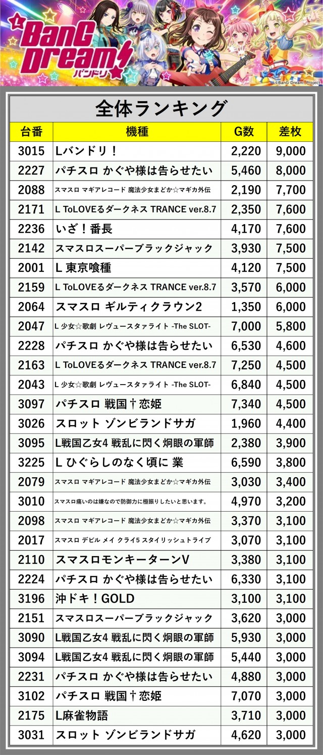 ※差枚数順に掲載しています