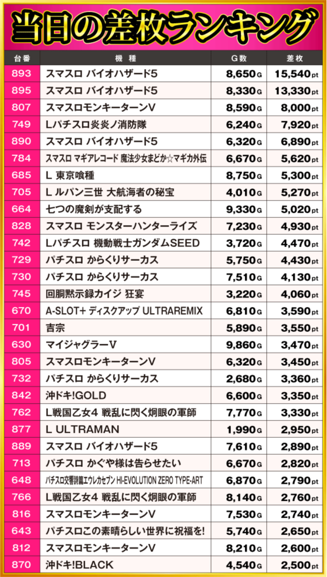 当日の差枚ランキング