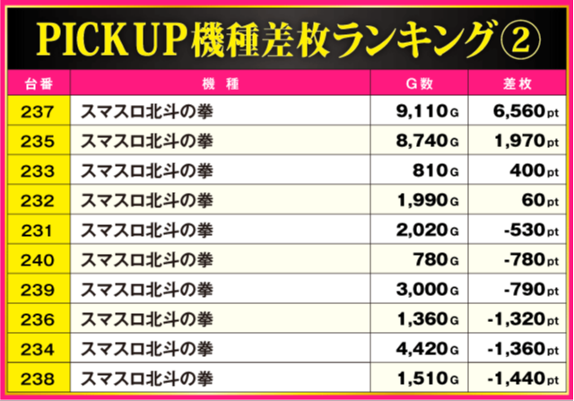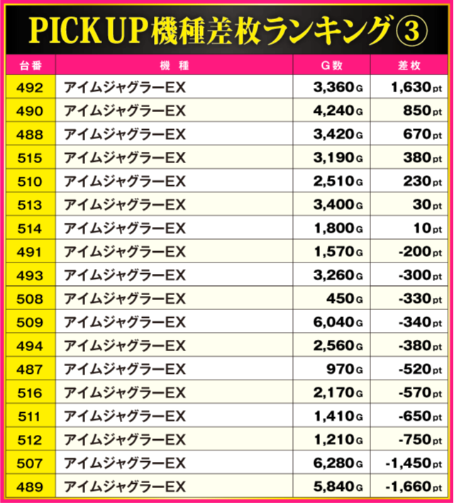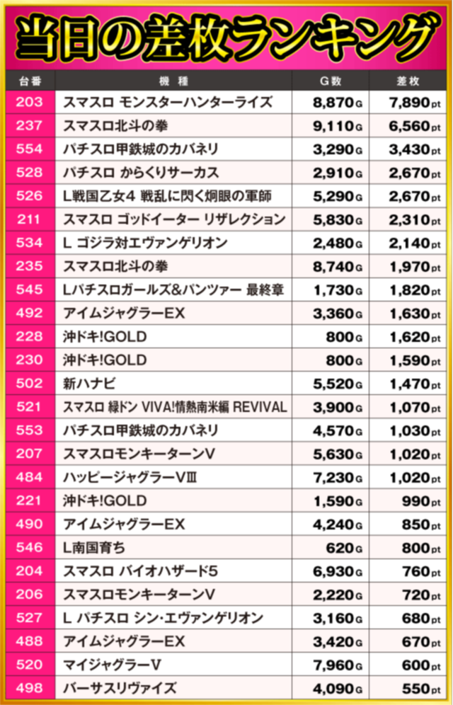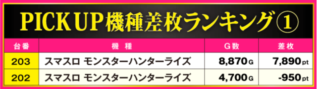 今回のPICK UP機種は全3機種で、差枚上位にランクインした『スマスロ モンスターハンターライズ』と『スマスロ北斗の拳』以外に『アイムジャグラーEX』からも多数の好調台を確認。それぞれのシマは常に活気に満ち溢れており、ファンにとって充実の一日となったのは間違いないだろう。