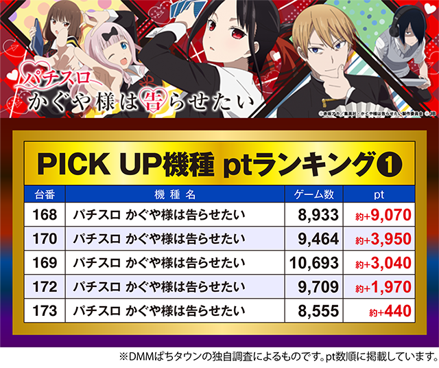 「パチスロ かぐや様は告らせたい」の168番台が約+9,070pt!!