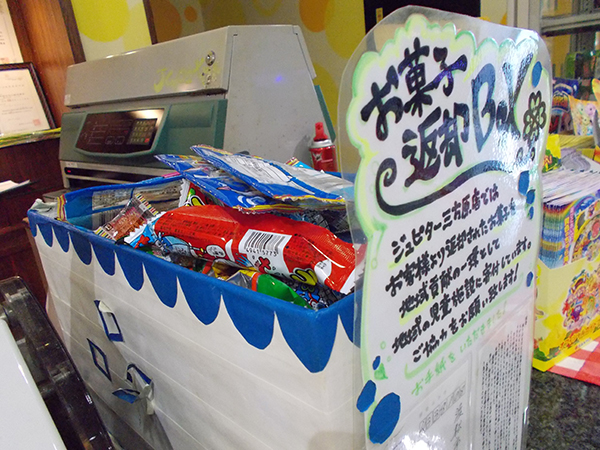 景品コーナーには「お菓子返却BOX」なる箱が置かれている。こちらは端玉で交換したお菓子を寄付する場所となっており、集まったお菓子は地域の児童施設に寄付される仕組み。プレイヤーの善意が子供たちの笑顔を作り上げる、何とも美しい取り組みだと感じた。