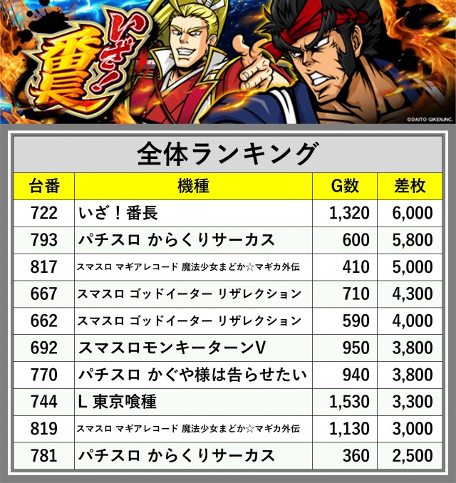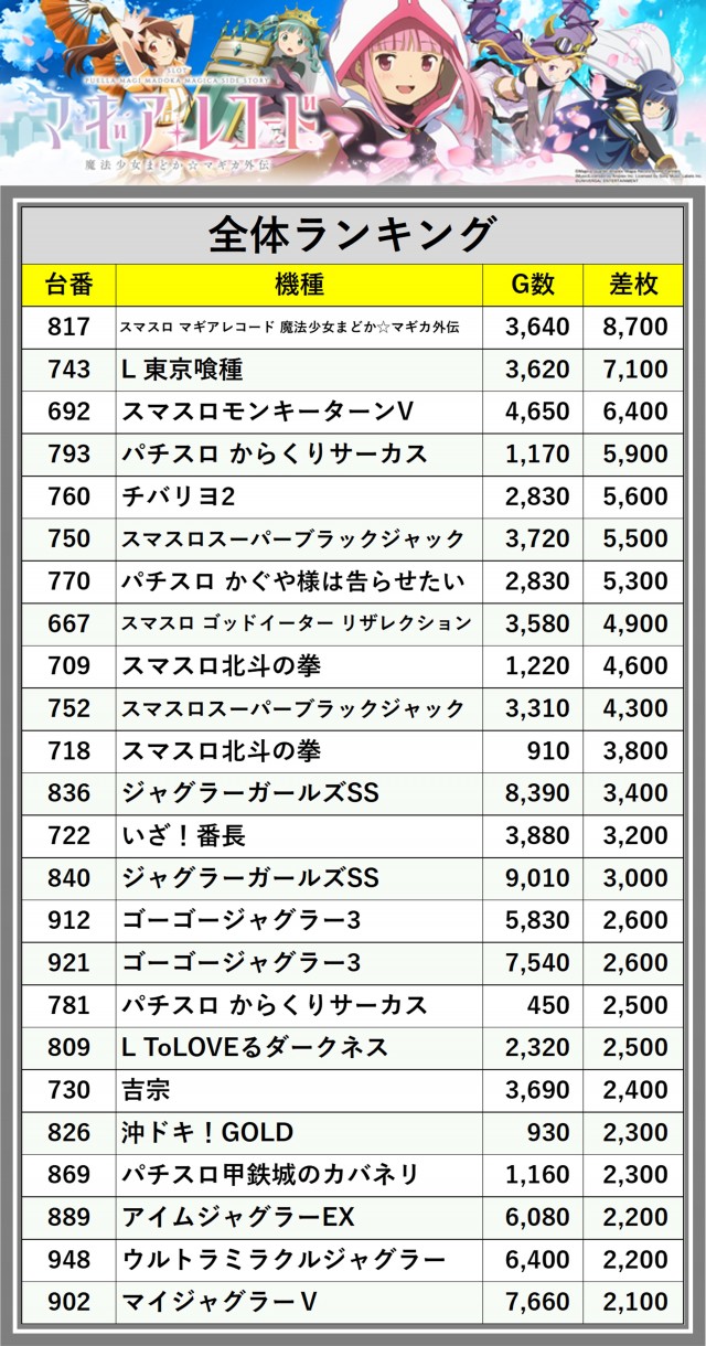 厳選された取材対象機種をはじめ、その他スロット全体から好記録が飛び出した!プレイヤーが楽しんだ1日を下記データにて振り返ってみて欲しい。