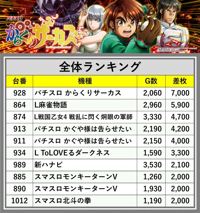 厳選された取材対象機種をはじめ、その他スロット全体から好記録が飛び出した!プレイヤーが楽しんだ1日を下記データにて振り返ってみて欲しい。