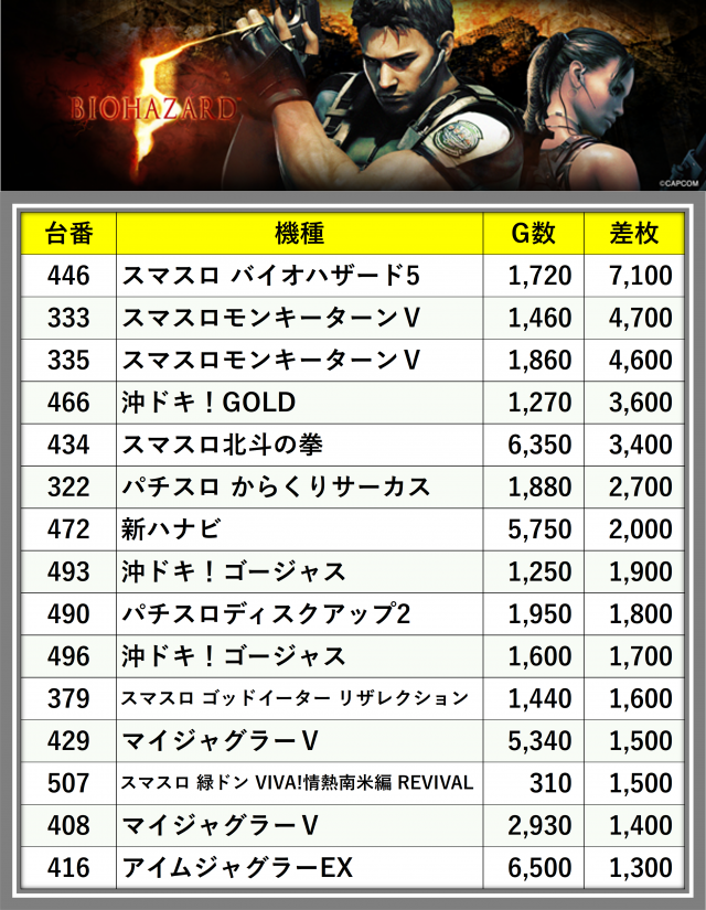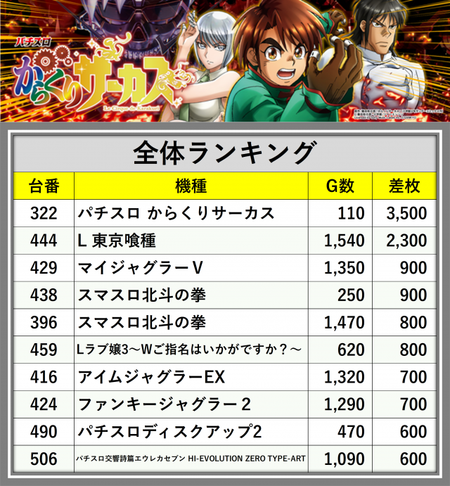 厳選された取材対象機種をはじめ、その他スロット全体から好記録が飛び出した!プレイヤーが楽しんだ1日を下記データにて振り返ってみて欲しい。