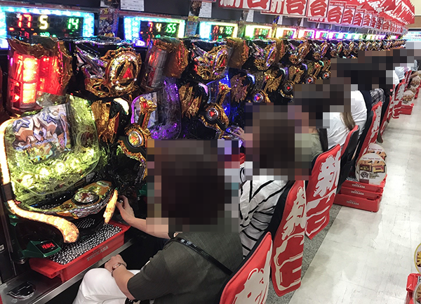 夕方頃の4円パチンコをみてみると、新台の「CR牙狼GOLDSTORM翔」が盛況。フル稼働となっているだけでなく、華麗なパフォーマンスを披露するプレイヤーも目立っていた。