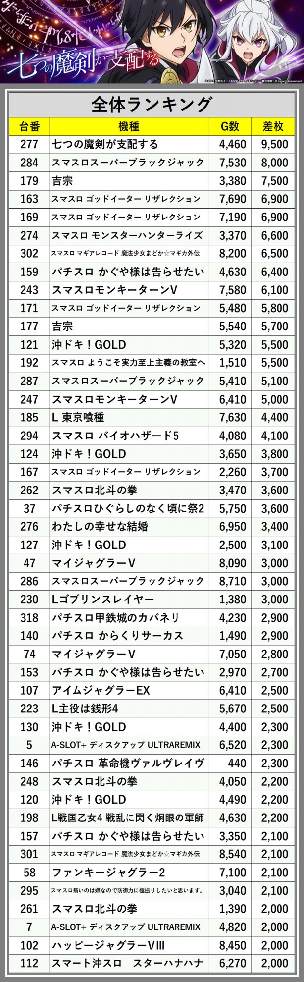 厳選された取材対象機種をはじめ、その他スロット全体から好記録が飛び出した!プレイヤーが楽しんだ1日を下記データにて振り返ってみて欲しい。