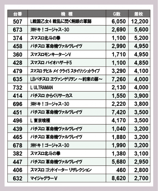 機種別差枚ランキング