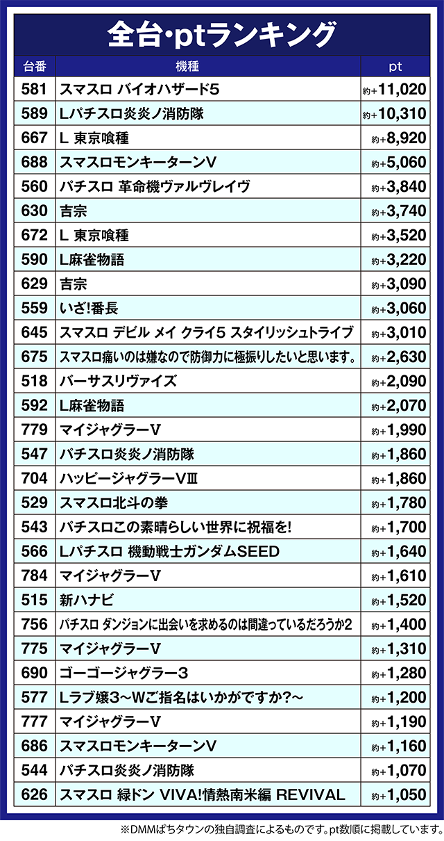 ほかにも、「パチスロ 革命機ヴァルヴレイヴ」の560番台や「吉宗」の630番台など、多くの台が約+3,000ptを上回った。