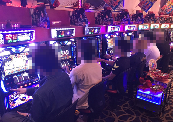 パチスロにおいて、とくに盛り上がっていたのが「沖ドキ!-30」と「バジリスク~甲賀忍法帖~絆」。プレイヤーたちのイキイキとした表情からは、満足度の高さもうかがえた。