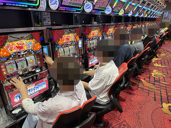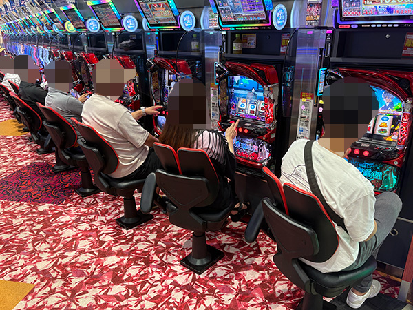 取材時は多くのプレイヤーが来店。パチンコ・パチスロともに、様々な機種が支持を得ていた。