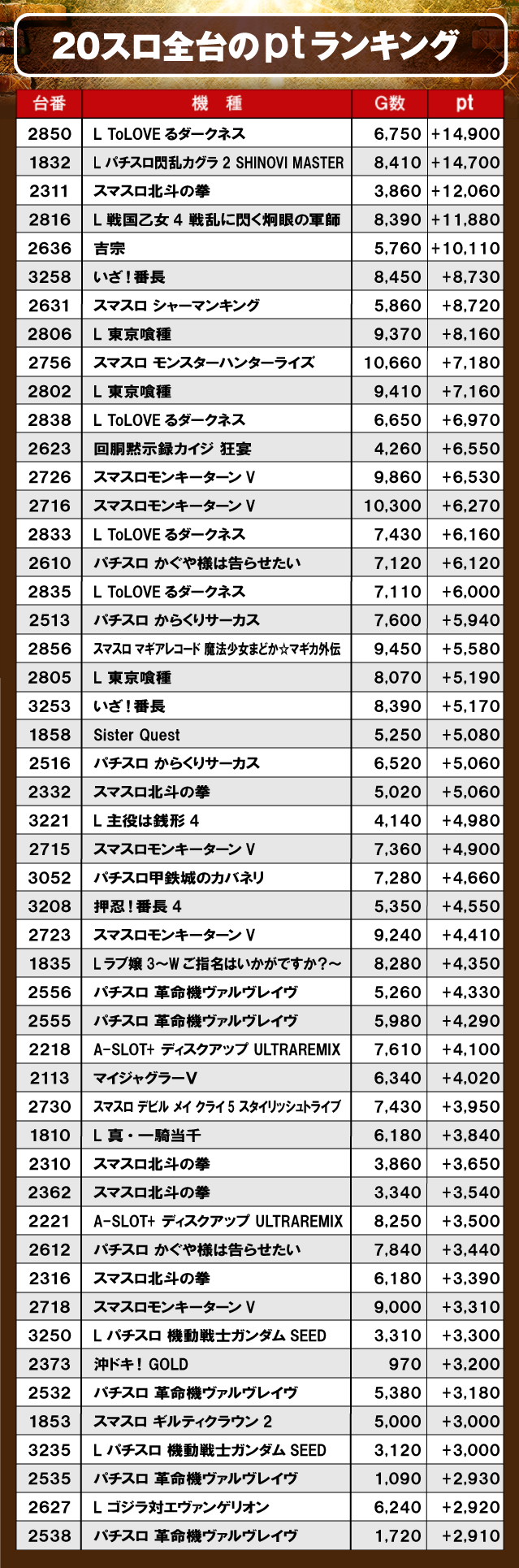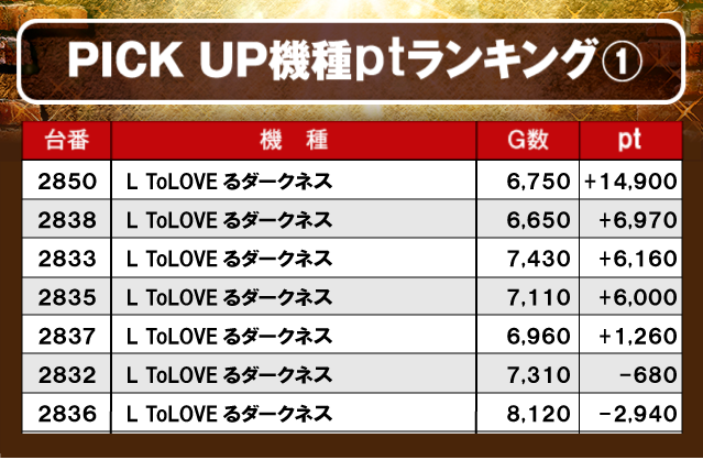 『L ToLOVEるダークネス』『Lパチスロ閃乱カグラ2 SHINOVI MASTER』『スマスロ北斗の拳』『L戦国乙女4 戦乱に閃く炯眼の軍師』『吉宗』から万ptOVERが発生。そのほか、末尾6から好調台が多数うまれており、幅広い機種でチャンスが隠されていたようだ!