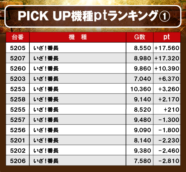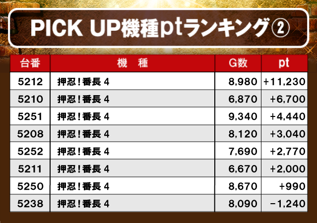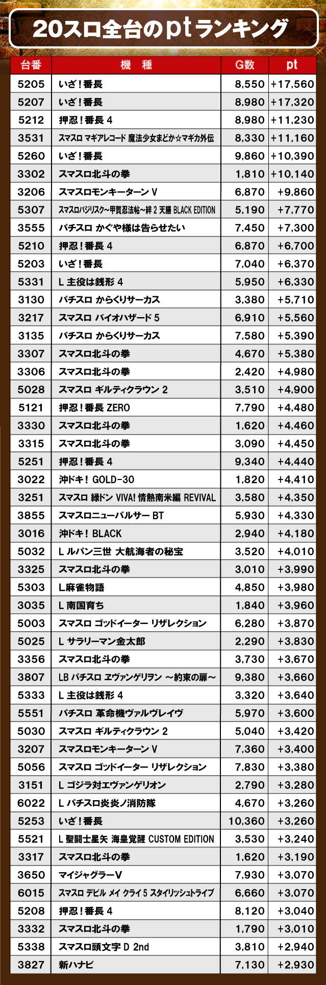 『いざ!番長』『押忍!番長4』『スマスロ マギアレコード 魔法少女まどか☆マギカ外伝』『スマスロ北斗の拳』から万ptOVERが飛び出し、さらに『スマスロモンキーターンV』が+9,860ptと追随。その他にも店内には大台突破台が多数生まれており、熱気に包まれていたと言えるだろう。