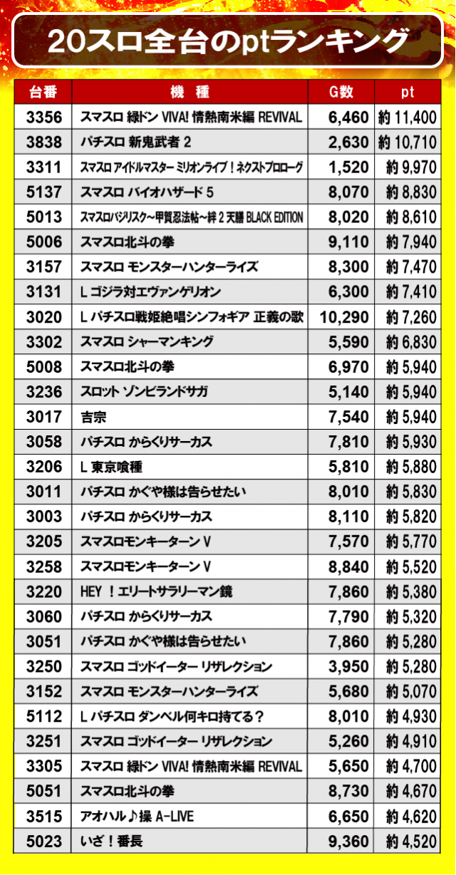 『スマスロ 緑ドン VIVA!情熱南米編 REVIVAL』『パチスロ 新鬼武者2』の2台から万ptOVERが発生し、当日の店内に大きな熱気をもたらした。さらに『スマスロ アイドルマスター ミリオンライブ!ネクストプロローグ』は惜しくも万ptを逃す約9,970ptだが店内の盛り上がりに大きく貢献していた。また終日を通して打ち込まれた台が多数あることから手応えを感じていたのは間違いなく、有意義な時間を過ごしていたことだろう。