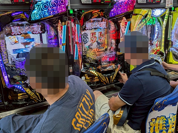 15時ごろの4円パチンコの様子を見ると「e 東京喰種」や「e マギアレコード 魔法少女まどか☆マギカ外伝」、「e東京リベンジャーズ」が大盛り上がり。機種性能を存分に発揮するプレイヤーを目の当たりにしている。