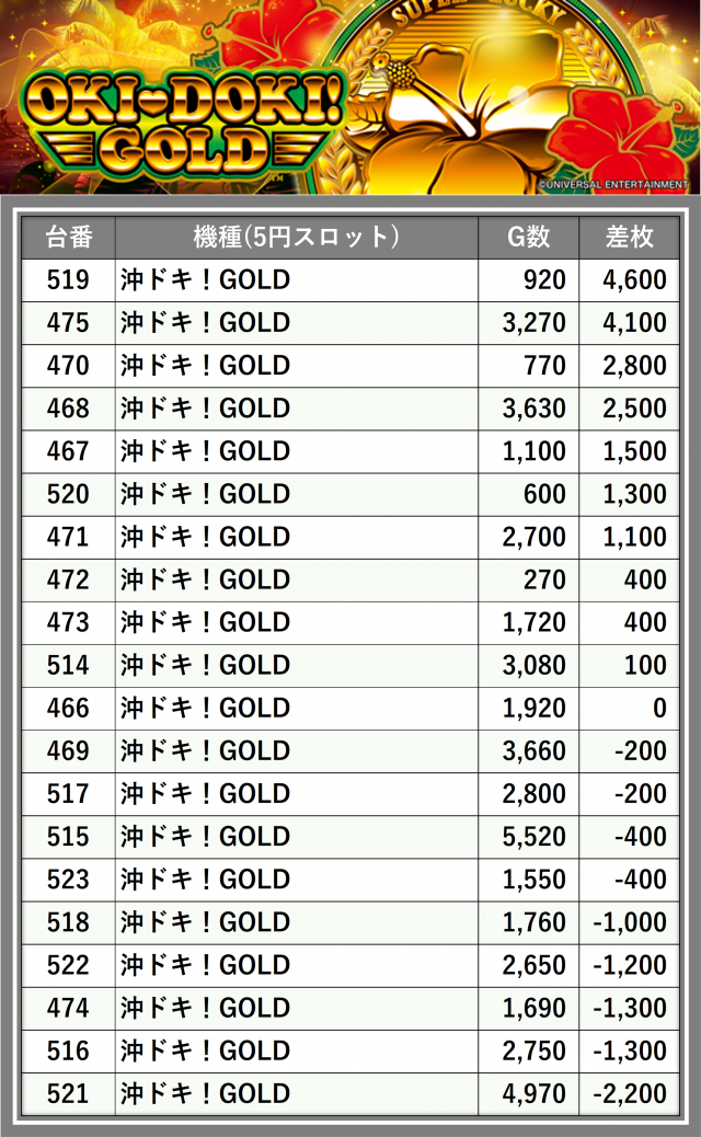 厳選された取材対象機種をはじめ、その他スロット全体から好記録が飛び出した!プレイヤーが楽しんだ1日を下記データにて振り返ってみて欲しい。