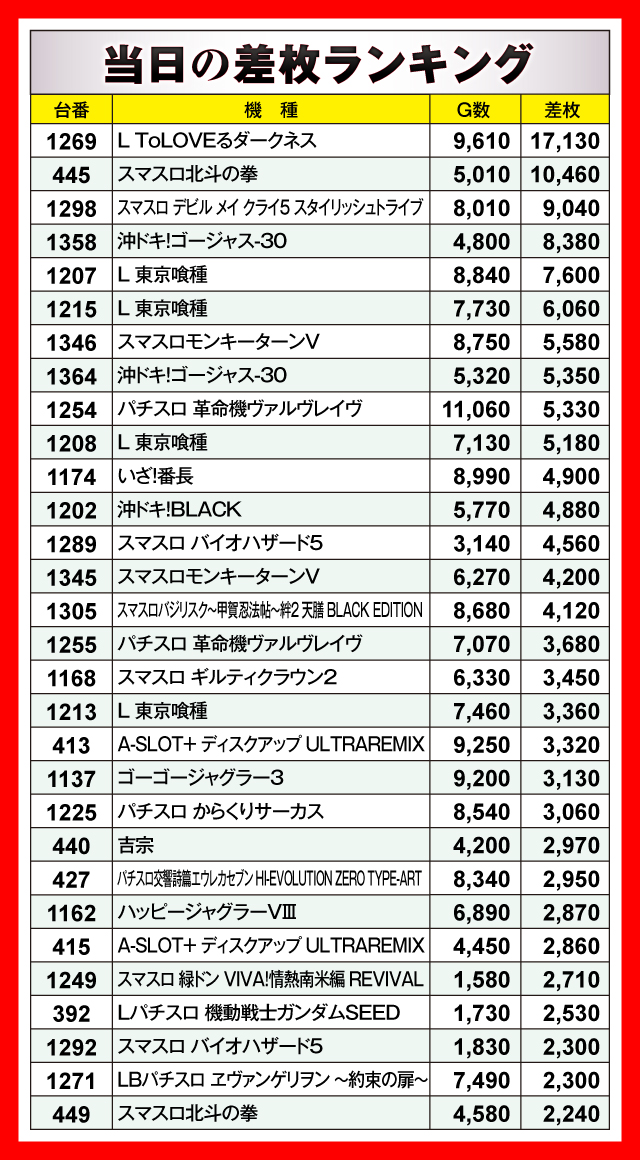 万枚を達成したのは2台。『L ToLOVEるダークネス』1269番台が+17,130枚、『スマスロ北斗の拳』445番台が+10,460枚とプレイヤー垂涎の好成績を残している。また『スマスロ デビル メイ クライ5 スタイリッシュトライブ』1298番台が+9,040枚、『沖ドキ!ゴージャス-30』1358番台が+8.380枚とつづく。以下にも『L 東京喰種』1207番台の+7,600枚、1215番台の+6,060枚などなど、優秀台だらけの圧巻のランキングとなっていた。