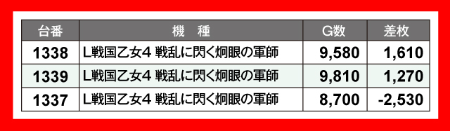 『L戦国乙女4 戦乱に閃く炯眼の軍師』も3台ともかなりの高稼働。うち2台がプラス差枚で終わっていた。