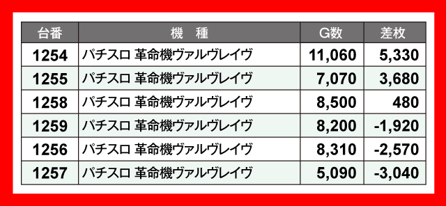 6台設置の『パチスロ 革命機ヴァルヴレイヴ』は3台がプラス差枚。1254番台が1万G超えを達成していて、好結果をもたらしている。