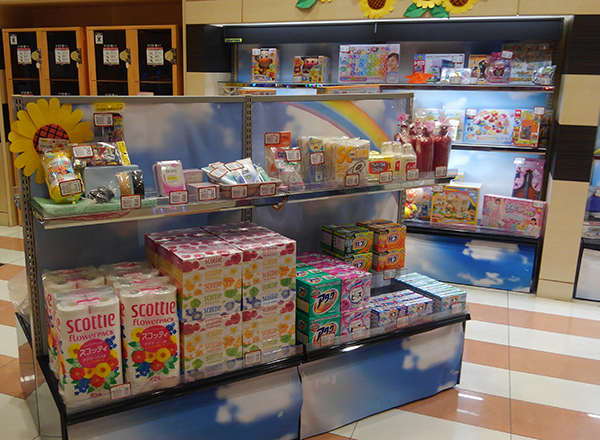 ラッピングされたコスメ用品や飲料水といった品揃えが豊富な賞品コーナーも印象的。キレイに陳列されているため、気になる賞品もすぐにみつかりそうだ。