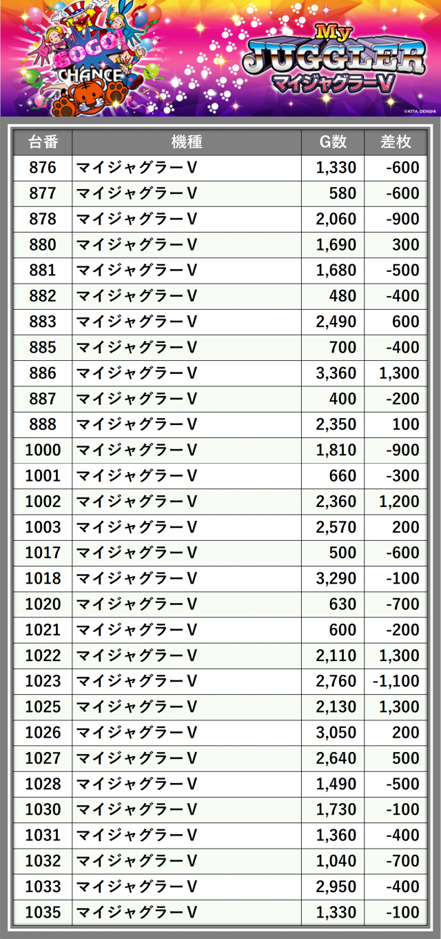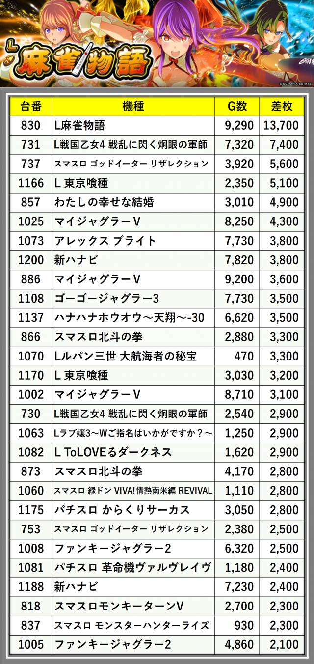厳選された取材対象機種をはじめ、その他スロット全体から好記録が飛び出した!プレイヤーが楽しんだ1日を下記データにて振り返ってみて欲しい。