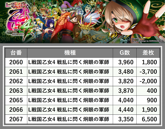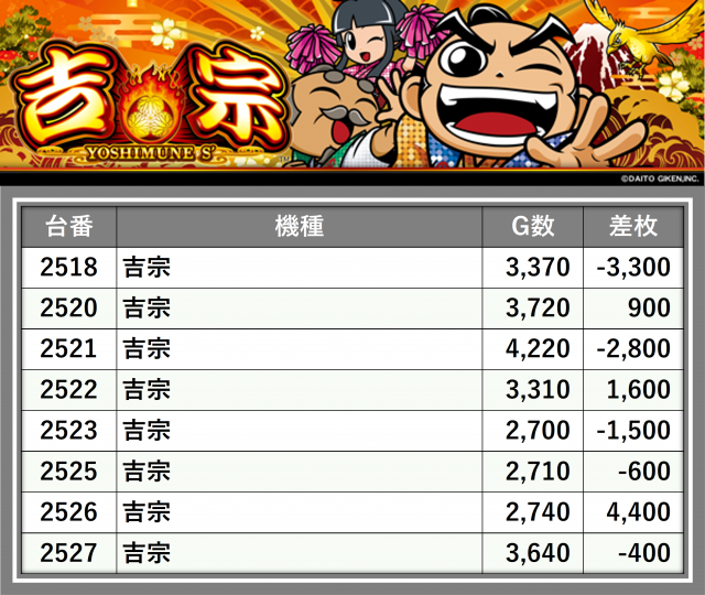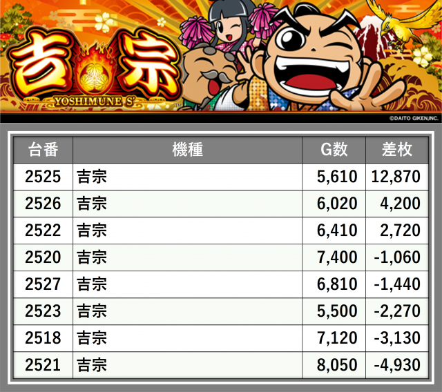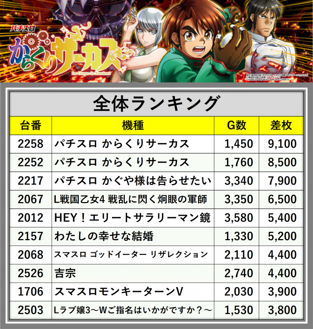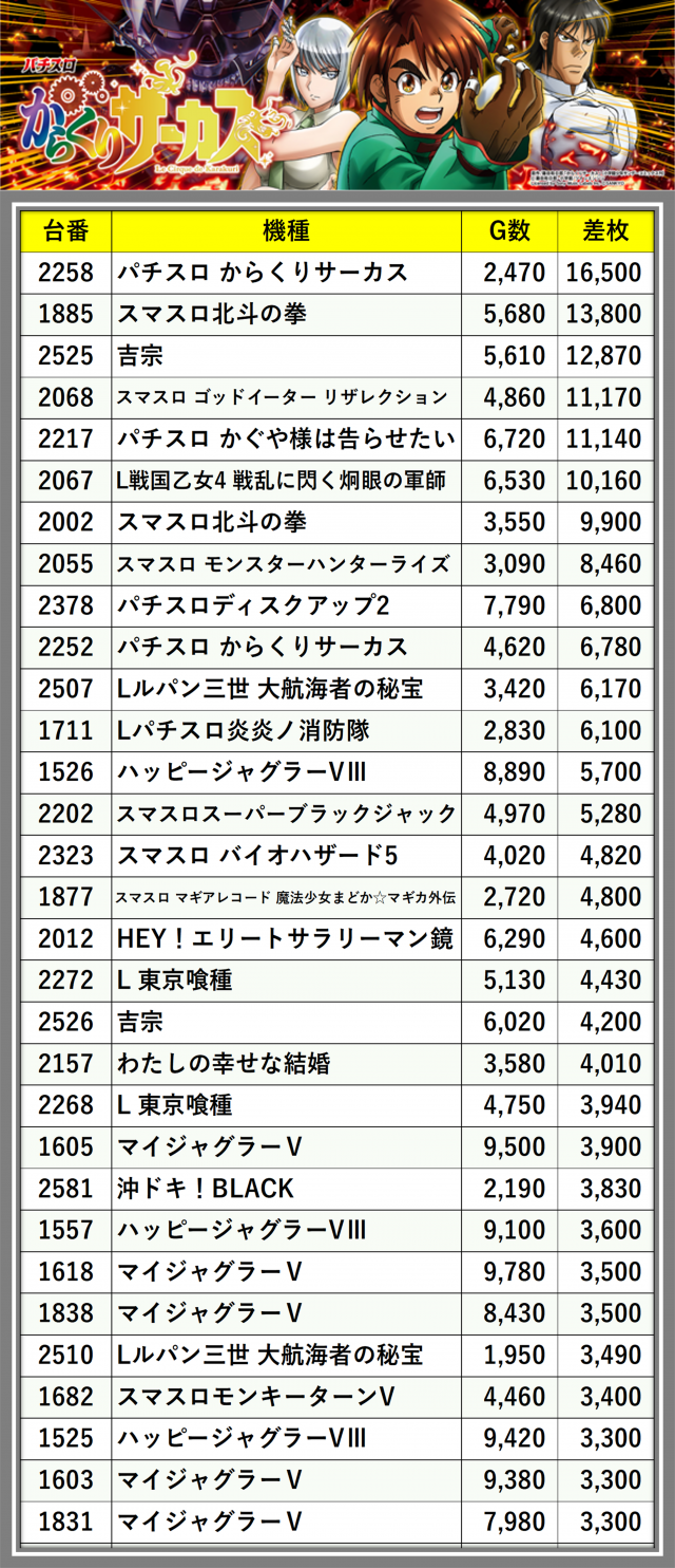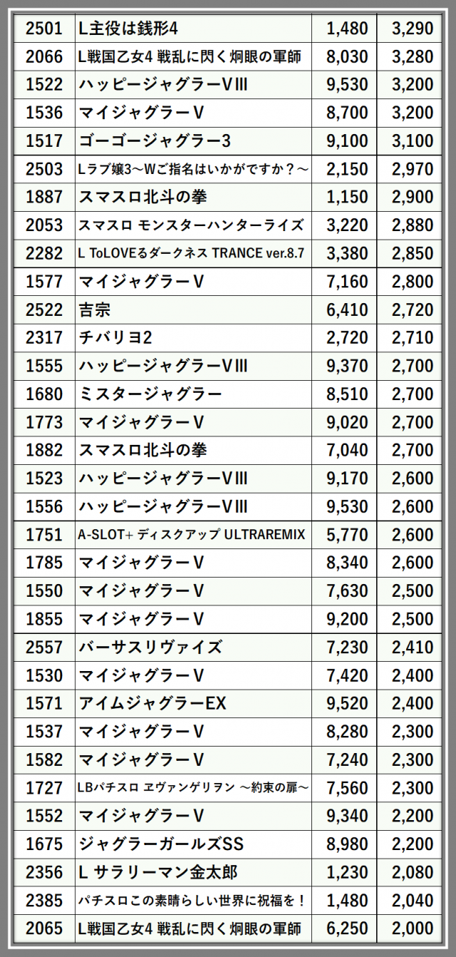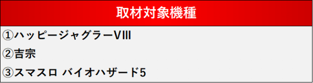 厳選された取材対象機種をはじめ、その他スロット全体から好記録が飛び出した!プレイヤーが楽しんだ1日を下記データにて振り返ってみて欲しい。