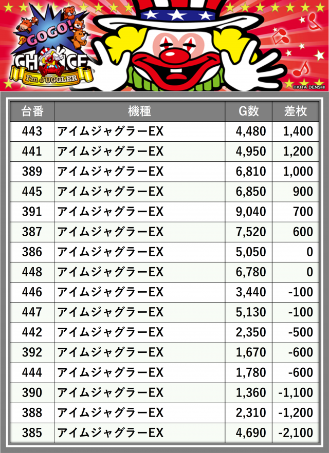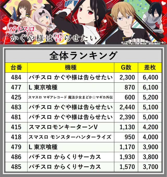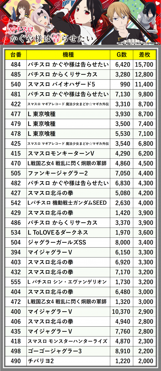※差枚数順に掲載しています