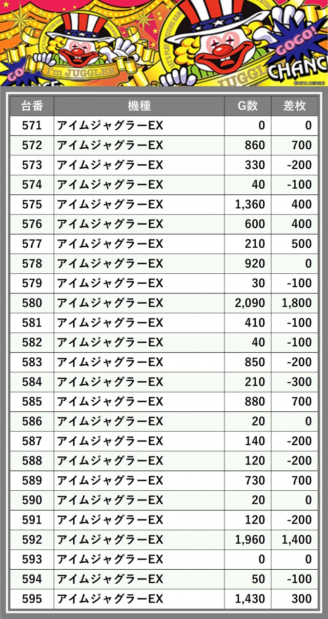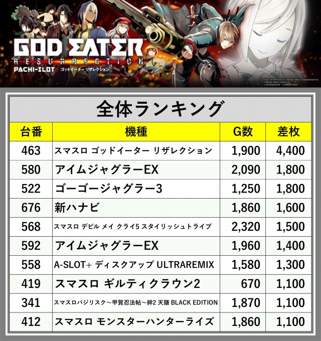 厳選された取材対象機種をはじめ、その他スロット全体から好記録が飛び出した!プレイヤーが楽しんだ1日を下記データにて振り返ってみて欲しい。