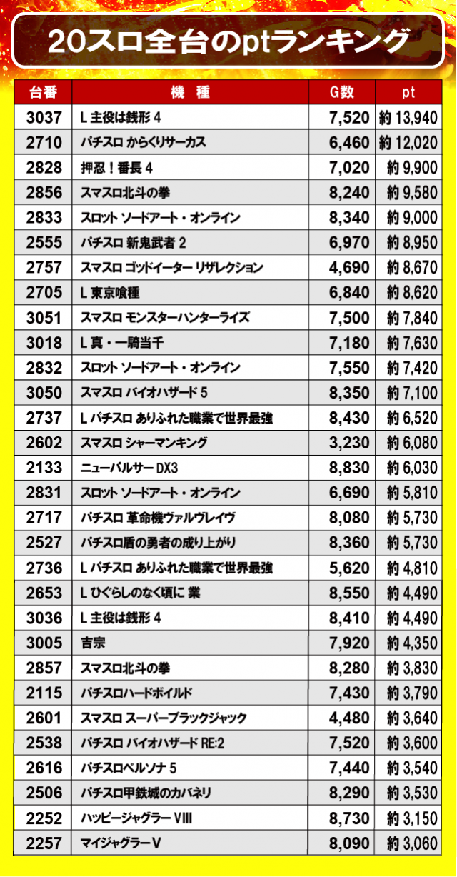 ランキングにはAT機からノーマル機に至るまで、幅広い機種群が名を連ねており、誰もが手応えを感じていたのではないだろうか。その結果『L主役は銭形4』『パチスロ からくりサーカス』から万ptOVER、『押忍!番長4』『スマスロ北斗の拳』『スロット ソードアート・オンライン』から約9,000ptOVERをマーク!他にも多くの機種が大台突破台に続いており、遊技していたファンは凄まじい熱気を肌で感じていたことだろう。