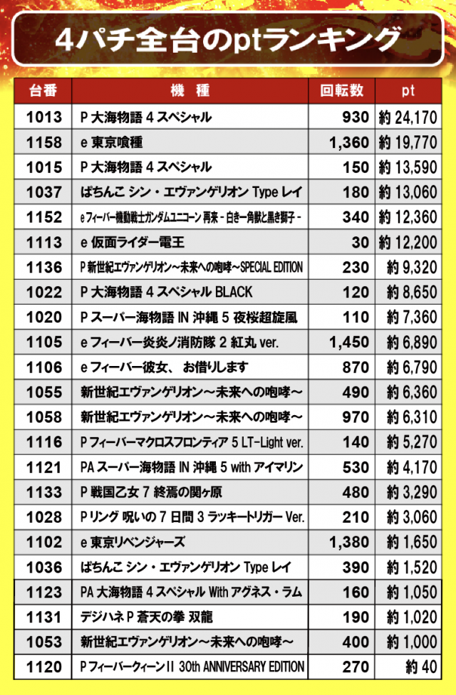 この日、パチンココーナーでトップを飾ったのが『P大海物語4スペシャル』で約24,170ptを獲得!それに続き『e 東京喰種』から約19,770ptをマークするなど、店内の盛り上がりに大きく貢献していた。