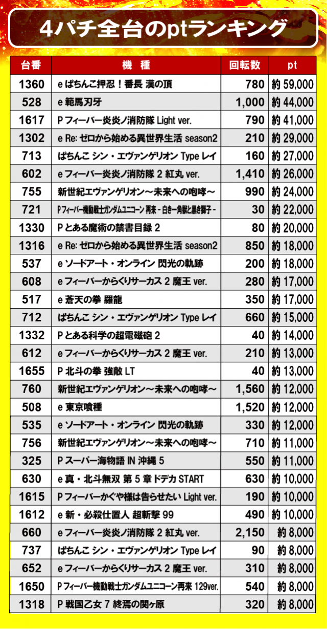 『eぱちんこ押忍!番長 漢の頂』から約59,000ptをマーク!それに続き『e範馬刃牙』『Pフィーバー炎炎ノ消防隊Light ver.』から約40,000ptOVERが生まれるなど好成績を残す盛況ぶりで、パチンココーナーからも熱気が満ち溢れていたようだ!