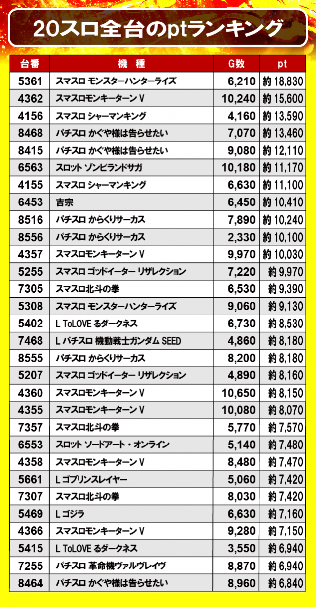20スロ全台のptランキングは約6,000ptOVERからとなっており、さらに万ptOVERが11台を記録するなどハイレベルな激闘が繰り広げられていた!その中で、『スマスロ モンスターハンターライズ』がコンプリート目前の約18,830ptをマーク!全体的に好調な台が多く、各所でファンが笑顔を浮かべる光景が広がっていた。