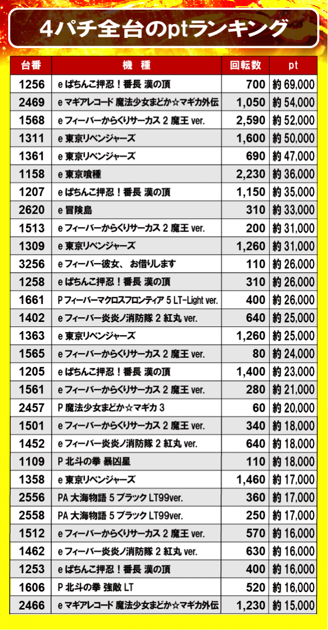 今回トップを飾った『eぱちんこ押忍!番長 漢の頂』は約69,000ptと圧倒的熱量を披露。さらに『e マギアレコード 魔法少女まどか☆マギカ外伝』『eフィーバーからくりサーカス2 魔王ver.』『e東京リベンジャーズ』も50,000ptOVERと続き、パチンココーナーでもスロットに負けず劣らず、幅広い機種が好調ぶりを見せ、各所で熱い展開が点在していた!