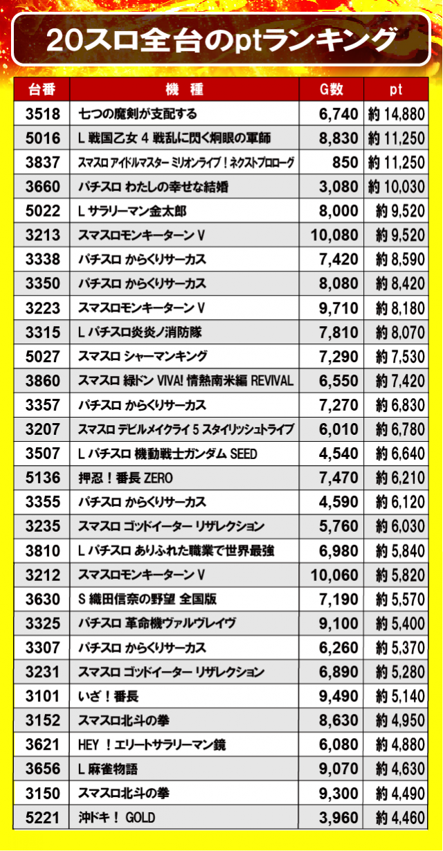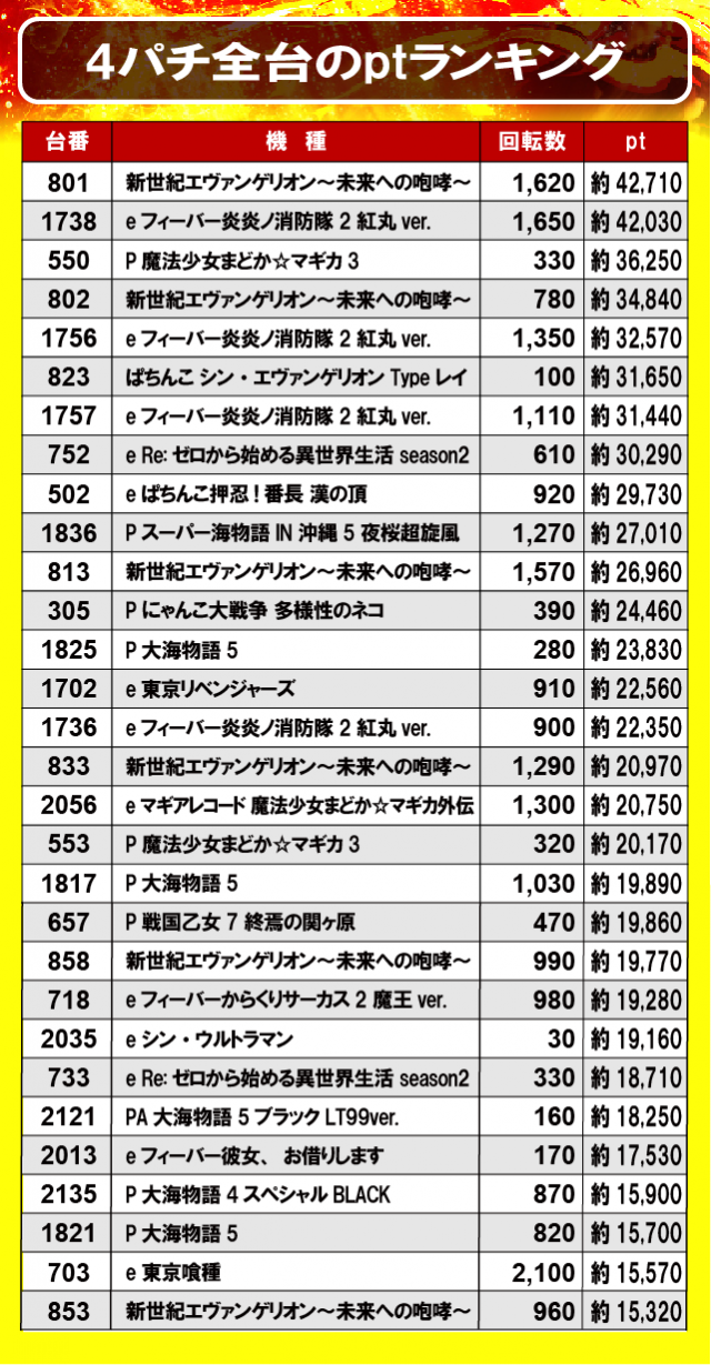 パチンココーナーはランキングの半分以上が約20,000ptOVER!大きくptを獲得していることも勿論素晴らしいが、回転数もしっかりと付いている「新世紀エヴァンゲリオン〜未来への咆哮〜」は状況が良かったことが窺え、遊戯していたファンの満足度もきっと高かったことだろう。