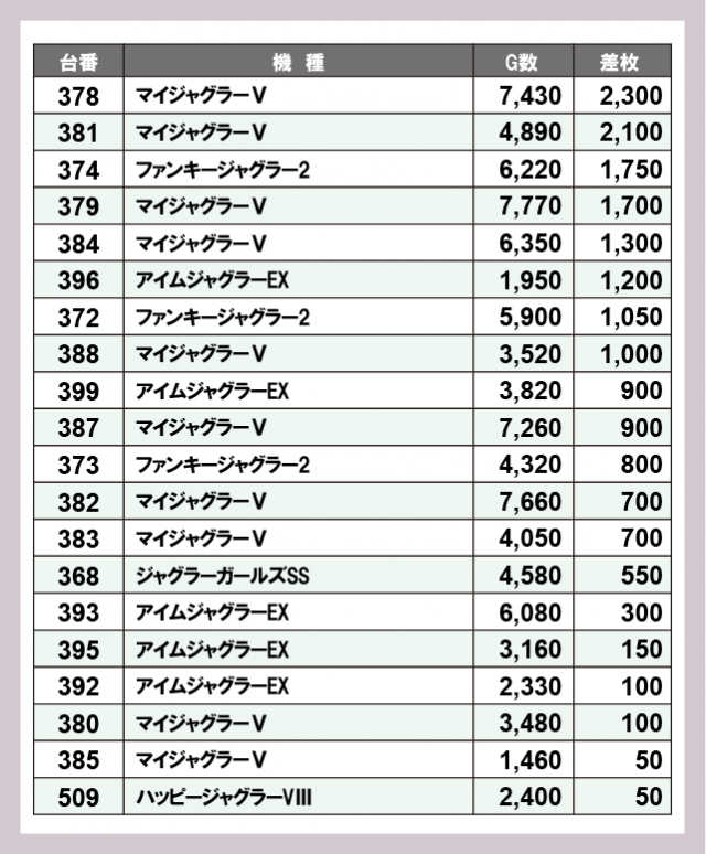 ジャグラー差枚ランキング
