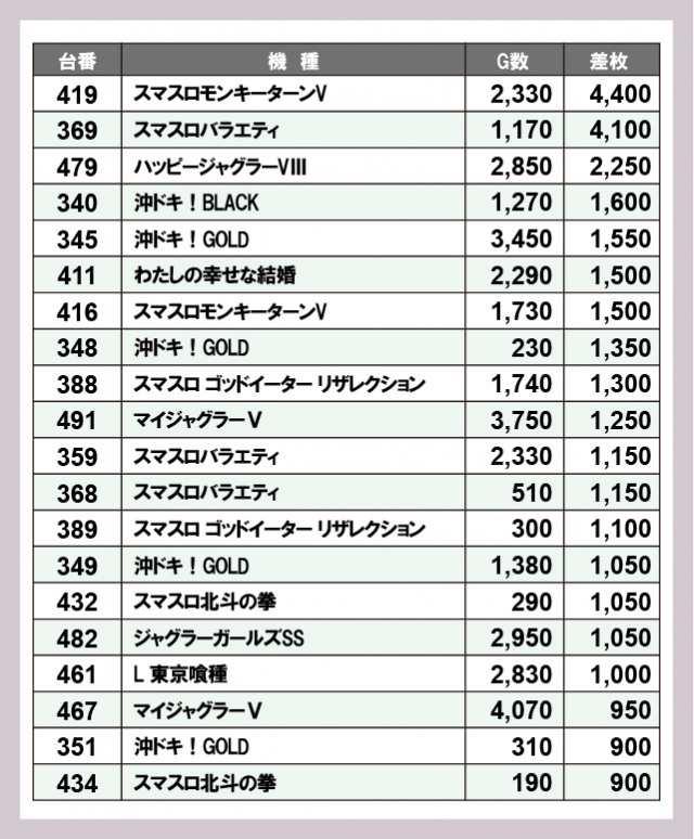 ※差枚数順に掲載しています