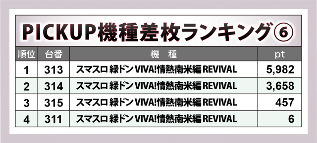 『スマスロ 緑ドン VIVA!情熱南米編 REVIVAL』5台は勝率の高さが目立ち、313番台が+6千弱、その下にも+3千7百弱が1台と、クオリティは高かった。