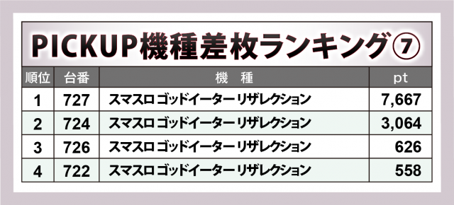 『スマスロ ゴッドイーター リザレクション』7台も半数超が勝利。727番台が+7千7百弱のスマッシュヒットを残し、その上+3千1百弱が1台カウントされた。