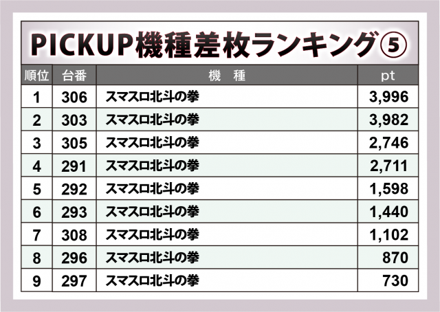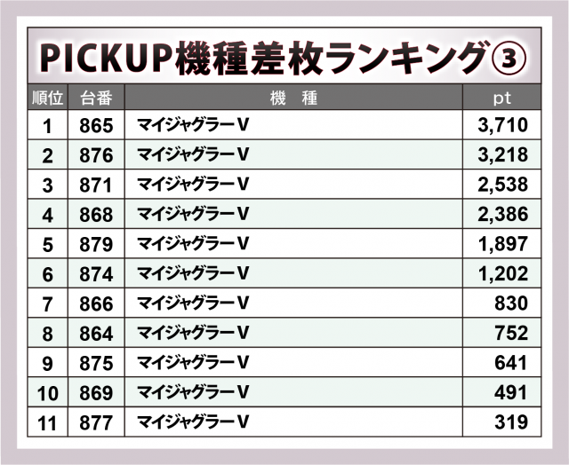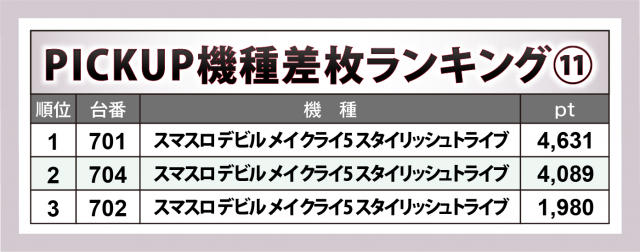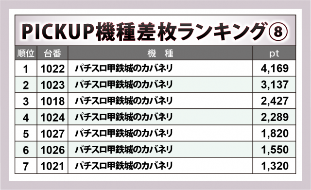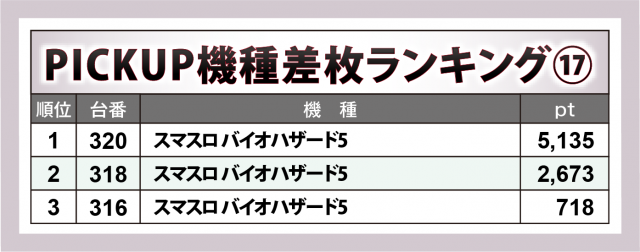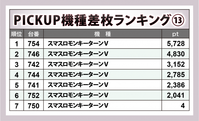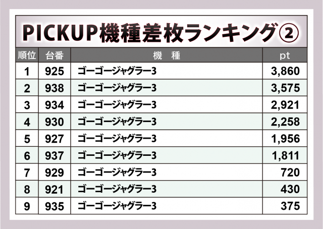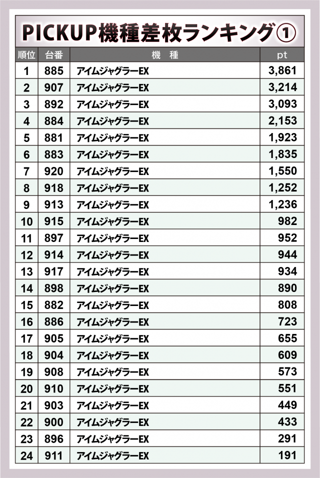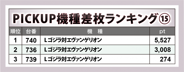 この日は多くの機種に好調が見て取れた。メイン機種に肉薄した15のマシンを見ていこう。