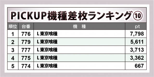 『L 東京喰種』8台では5台が勝利。5桁プラスの台こそ見受けられなかったが、+7千8百弱・+5千6百超が1台ずつ&+3千超が2台と、重量級の出玉が並んだ。
