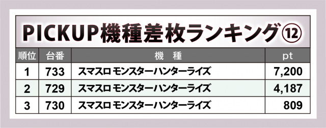 『スマスロ モンスターハンターライズ』7台はプラス率5割を満たせなかったが、+7千2百超・+4千2百弱が1台ずつと、スマッシュヒットを飛ばしていた。