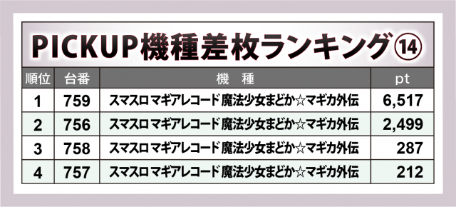 『スマスロ マギアレコード 魔法少女まどか☆マギカ外伝』6台も高勝率。759番台が+6千5百超となり、その他に+2千5百弱が1台と、他のシマに引けを取らない数値を残した。