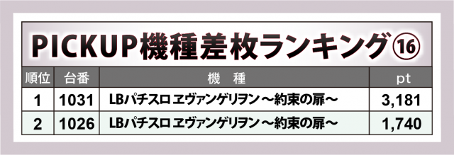 ボーナストリガー搭載の『LBパチスロ ヱヴァンゲリヲン ~約束の扉~』4台は半数の2台が勝利。+3千2百弱・+1千7百超が1台ずつと、着実な伸びが感じられた。