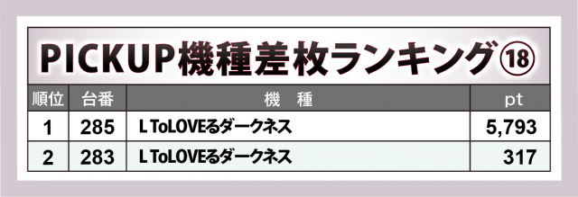 『L ToLOVEるダークネス』5台の勝利台数は少なめだったが、285番台の+5千8百弱という数字が光った。