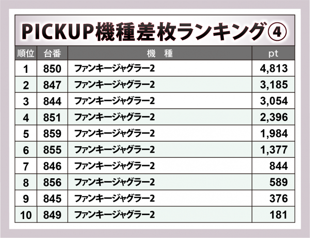 『ファンジャグ』20台ではピッタリ半数がプラス。850番台が+4千8百超でシリーズ一番の成績となった他に、+3千超・+1千超が2台ずつ&+2千4百弱が1台と、悪くない様相だった。