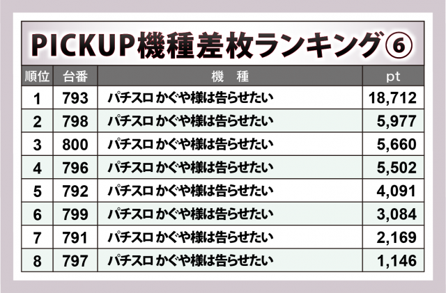 『パチスロ かぐや様は告らせたい』10台は勝利した8台全てが4桁以上のプラスを成し遂げた。793番台が+1万8千7百超で全401台の王座に君臨した上に、+5千5百超が3台&+4千1百弱・+3千1百弱・+2千2百弱・+1千1百超が1台ずつと、店内随一の好況となった。